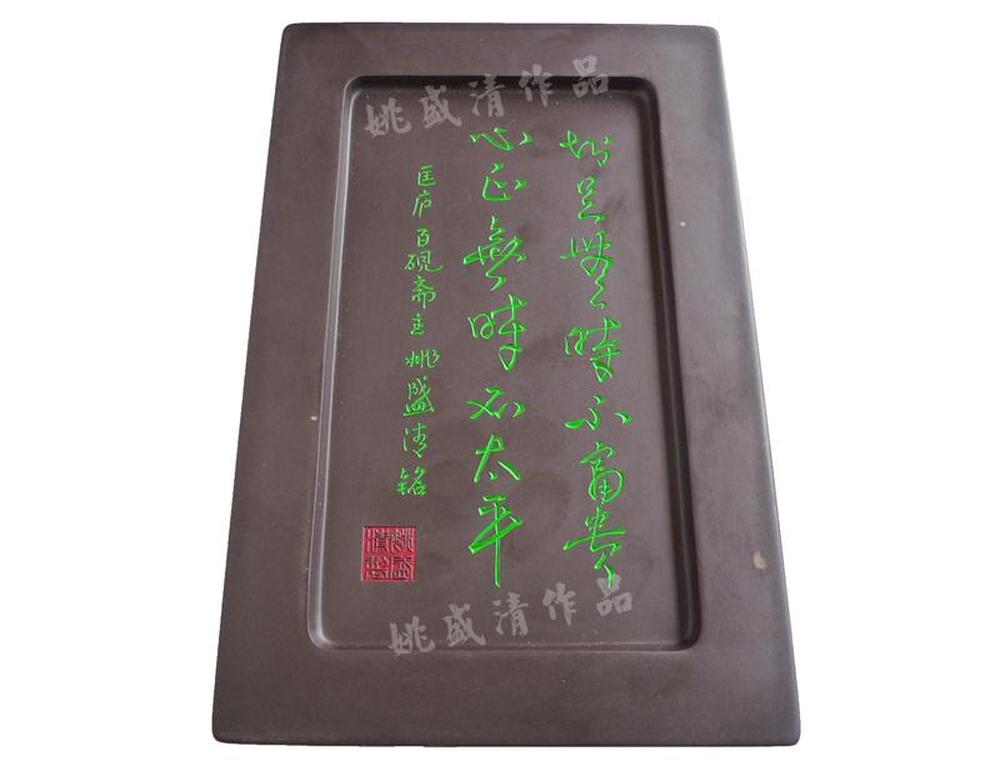 巧用砚石表面黄、绿膘,雕一凤首古瓶,瓶口高浮雕几枝牡丹花插于其中,牡丹枝叶穿插有致、叠让自然。花朵、花蕾婀娜多姿、极富变化。巧透下层紫黑色以衬托主体。瓶颈浮雕“太平富贵”四篆字以点题。寓意“平安富贵”砚边雕刻双不断纹,寓意连绵不断到永远。砚背题刻砚铭:“知足无时不富贵,心正无时不太平”。 它既是对主题的诠释,也是作者对人生的感悟。此砚造型方正,端庄稳重,其用色巧妙,雕工细腻,用意吉祥。且“质、工、品、铭、”具全,乃砚中上品也。